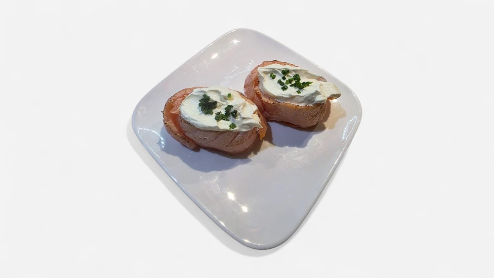 2 Stück, Lachs Nigiri umwieckelt & flambiert, mit Frischkäse und Schnittlauch